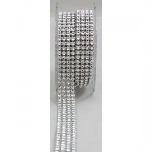 2 yards spool 4-row Strand of Acrylic, Sparkly, Rhinestones on Silver backing. Because of its sparkly look many call it diamond ribbon. 6/8" wide and total 2 yards "Bling" is where it's at! Add that extra sparkle to cakes, candles, dance and skating costumes along with your party and wedding decor. 4 row of faux sparkly rhinestones set on a Silver plastic backing is easy to work with. Cut to the length you need with simple household scissors.