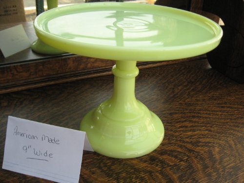 Measures nine inches across the top and seven and a quarter inches tall. This is a heavy cake stand cast in buttercream color glass. The entire smooth top is surrounded by a crumb rim. Hand made in Ohio