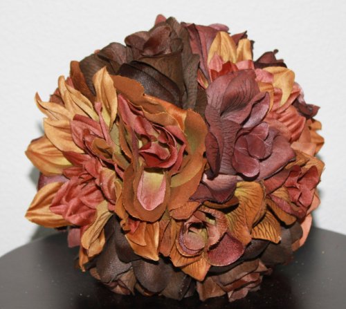This fully covered and beautiful bridal pomander ball is various shades of chocolate and brown roses and dahlias.It measures approx. 7" in diameter and hangs on 7" long chocolate ribbon.