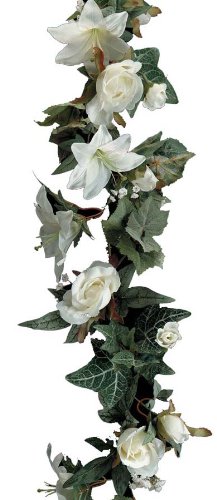 6 Foot long Silk floral garland is filled with creamy white lilies, roses and baby's breath and carefully enhanced with multi-shaped green silk vine leaves. The perfect garland for decorating pews, lattice work, tables, bridal arches and more. Realistic flowers have satin petal highlights and garlands are complete with end rings for joining garland lengths together. Easily create lovely floral arrangements.