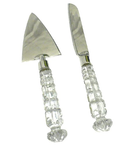 Enjoy this elegant and high quality faux crystal handled knife and cake server at your wedding or special event. Easily personalize by having the set engraved for the occasion. The neutral look of the pieces allows for your own decoration to coordinate with your special day. Set features handles of high quality, clear plastic with cut crystal look. Set makes a lovely gift and a great keepsake item.