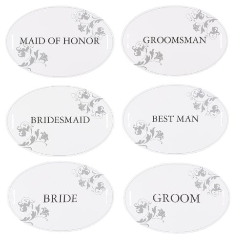 White, paper chair decorations are printed with wedding party titles and accented by silver flourishes. Decorations are secured into place by a 1-1/2 by 50-inch white satin ribbon. Package includes: 1 Bride, 1 Groom, 1 Maid of Honor, 1 Best Man, 4 Bridesmaid and 4 Groomsman. 12 chair decorations per package. 12-Inch oval is 8-Inch tall.